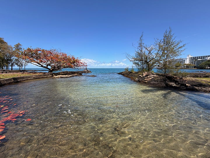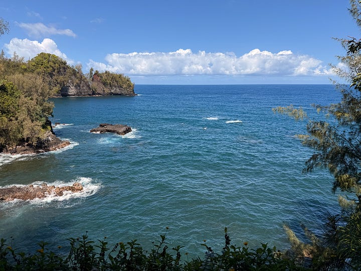 We sat overlooking Hilo Bay, watching the water and Mauna Kea rising in the distance, planes arriving from the other islands at the airport nearby. It was the kind of lunch that felt like it belonged in the trip... not rushed, not touristy, just right.