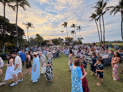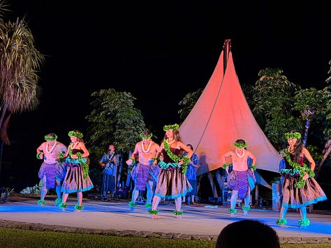 Traditional Hawaiian food... kalua pork, poi, lomi salmon, haupia for dessert. Cultural performances with hula dancing, fire dancing, and storytelling about Hawaiian history and traditions. We sat at a long table with other couples and families, chatting and laughing and enjoying the show.