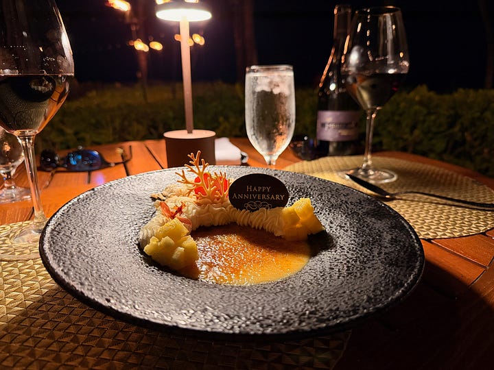 For dessert, they brought us crème brûlée topped with pineapple and whipped cream, complete with a tiny sign wishing us a happy anniversary.