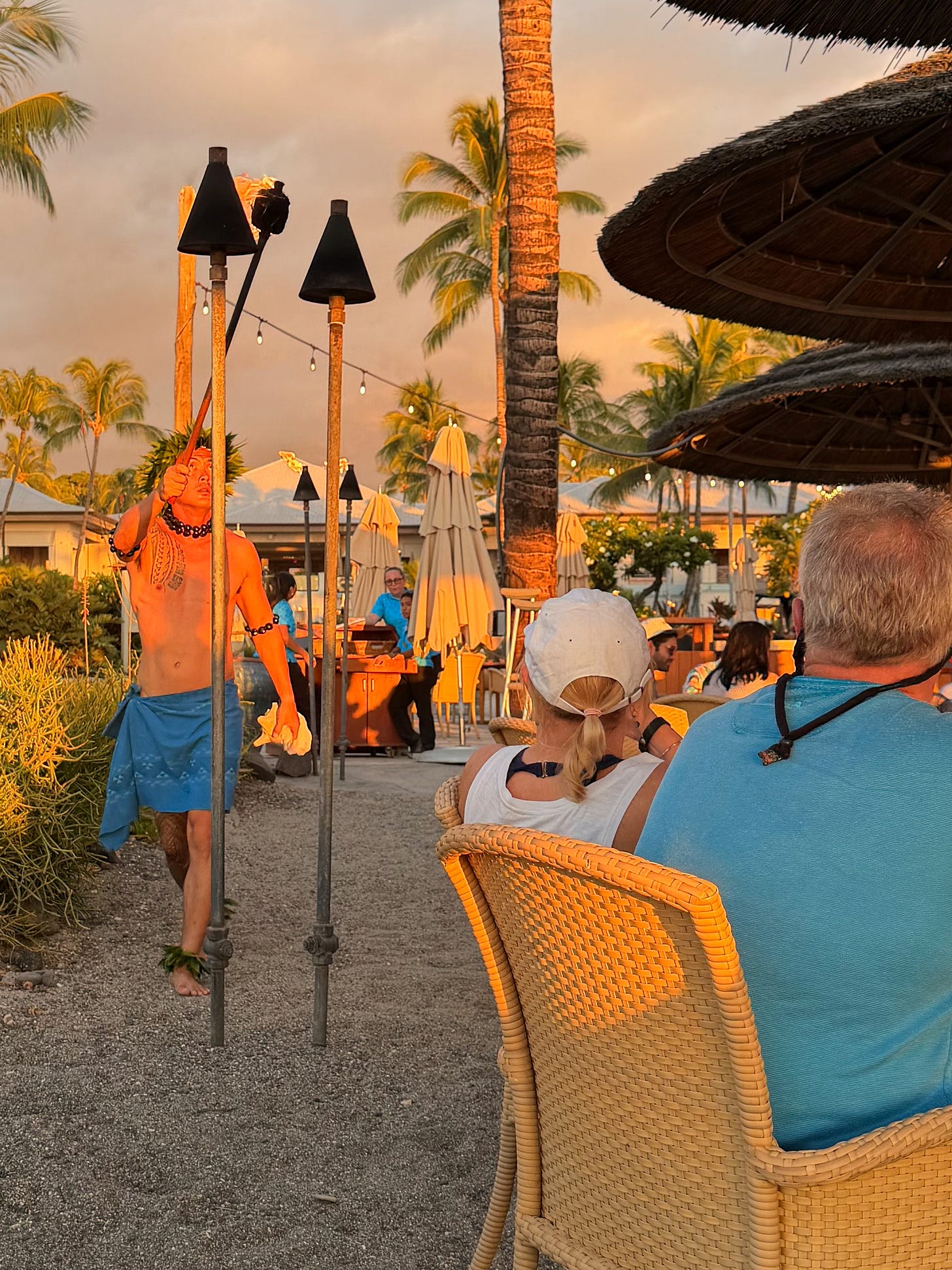 The sun dropped slowly over the ocean, painting everything gold and orange. Torches were lit along the pathways. The pū ceremony began... a conch shell blown to mark the sunset, a small ritual the resort did every evening. We sipped our cocktails and watched it all unfold.