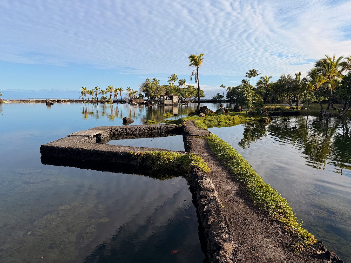 Sunday morning, we watched the sunrise over the mountains one last time... me with coffee, Nicole with tea... by the pool. Then we walked south on the beach trail to see the historic Hawaiian fish ponds... stone-walled enclosures where ancient Hawaiians had figured out how to create a mix of salt and fresh water. Young fish would swim in through small openings to feed, then grow too large to escape.
